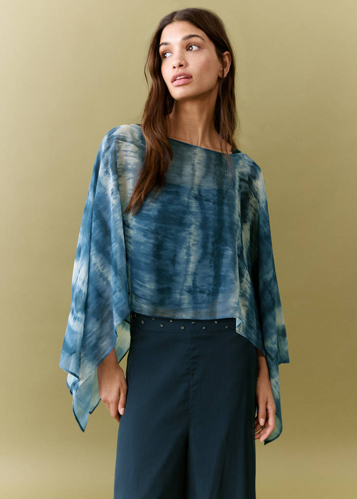 Текучая ткань. Короткая длина. Дизайн тай-дай. Дизайн с накидкой. Струящийся рукав. Изделие может быть слегка укороченным.
