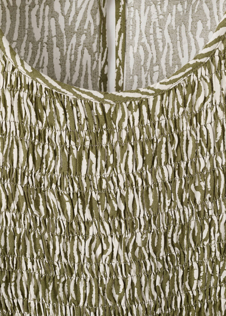 Жатая ткань пчелиные соты. Приталенный дизайн. Cut-out. Дизайн с принтом. Круглый вырез. Пышные рукава. Эластичные манжеты. Низ с оборкой. Застежка на пуговицу сзади. Total look.