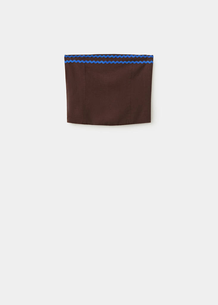 Ткань из смеси льна. Прямой крой. Кроп-дизайн. Дизайн бандо. Фестончатые детали. Контрастные детали.