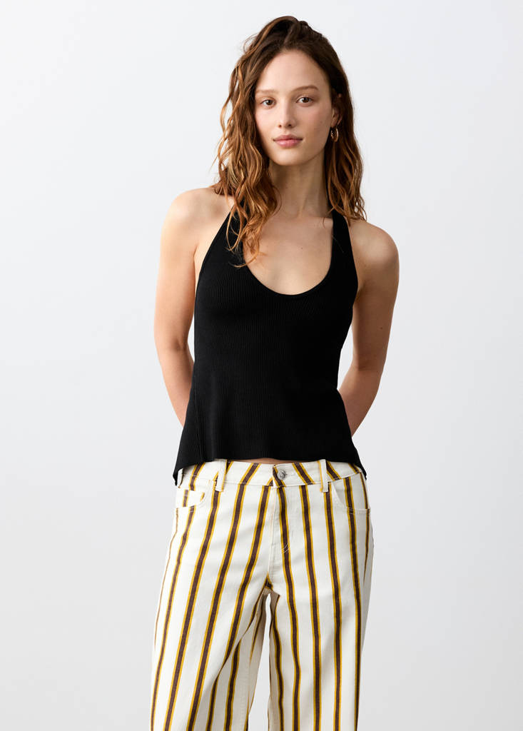 Трикотаж, связанный резинкой. Воротник халтер. Тонкие бретели. Завязка на спине. Открытая спина.