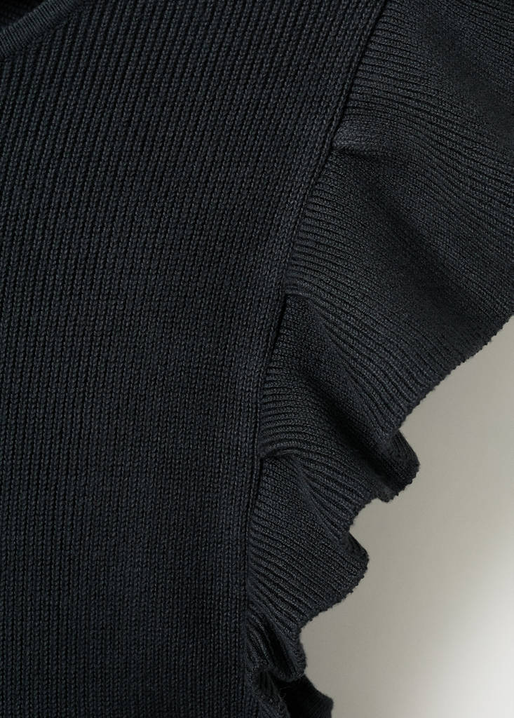 Трикотаж, связанный резинкой. Приталенный дизайн. Круглый вырез. Короткий рукав. На рукавах воланы. Перекрещенная спинка.