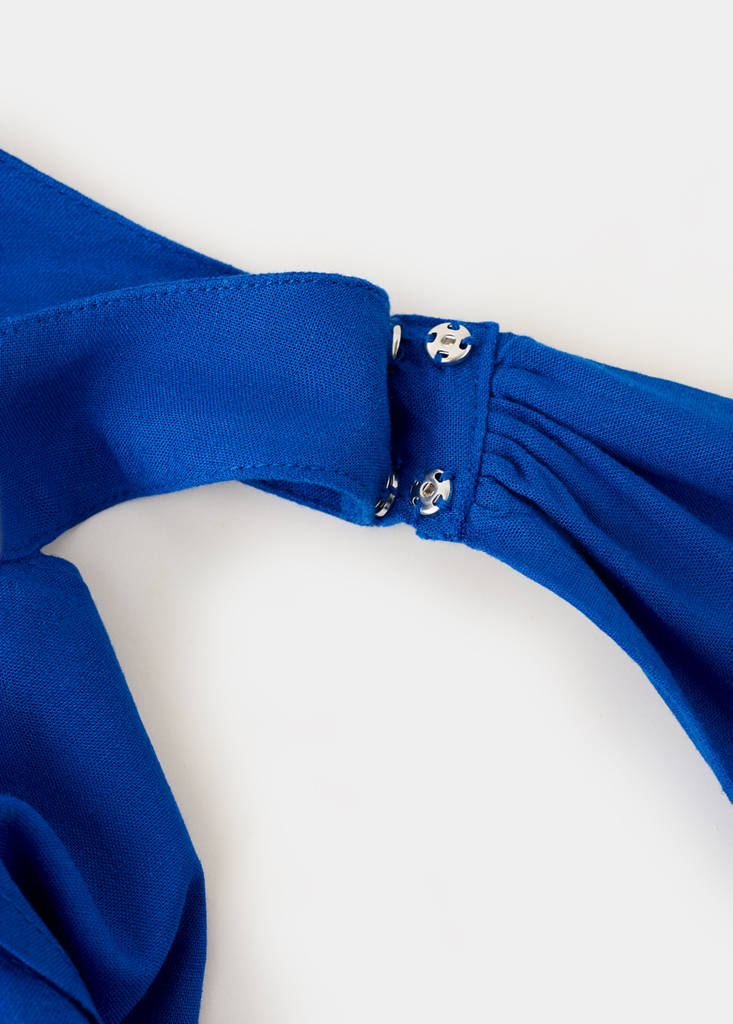 Ткань из смеси льна. Воротник халтер. Горловина украшена фуляром. Без рукавов. Сборка на талии. Застежка на пуговицы на воротнике.