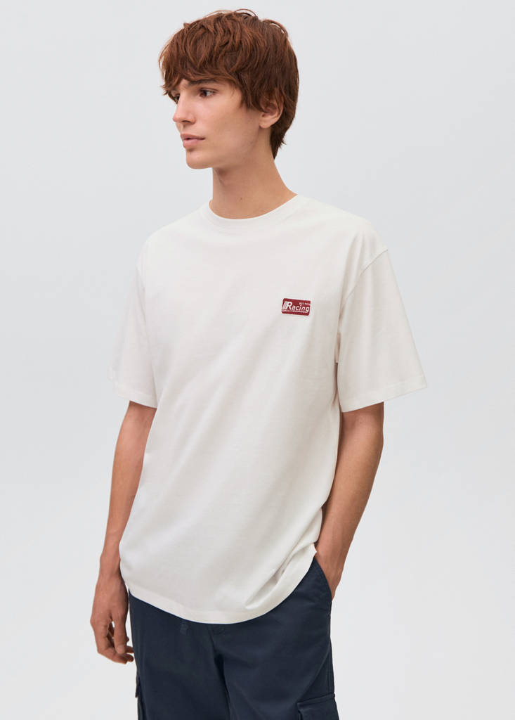 Футболка свободного прямого кроя из 100% хлопка имеет круглый вырез и короткие рукава. Она украшена вышивкой и принтом в виде надписи на спине. Изделие изготовлено из экологически устойчивых материалов