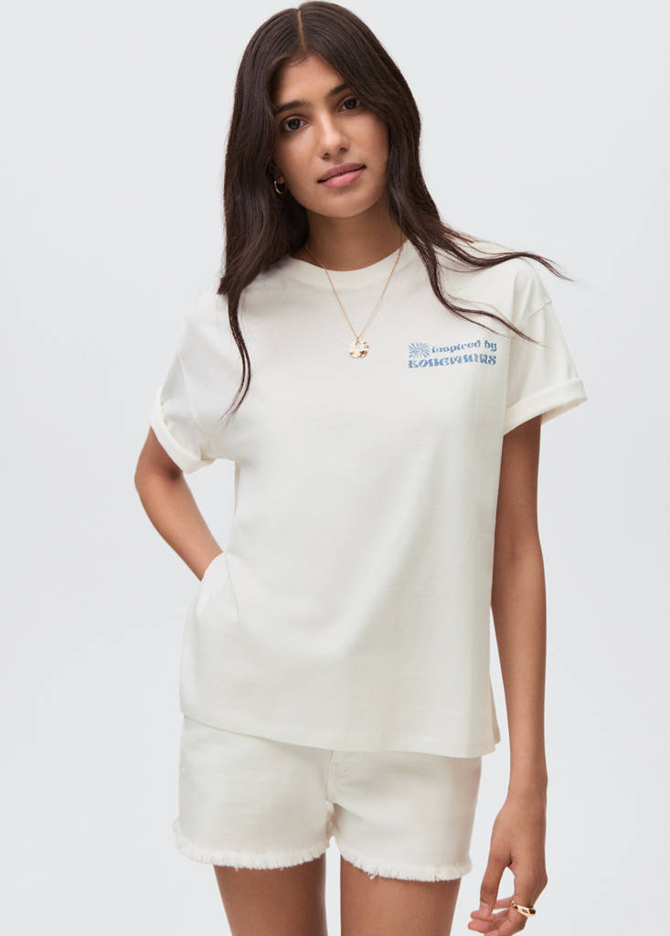 Ткань 100% хлопок. Прямой крой. Дизайн с принтом. Дизайн солнца. Круглый вырез. Короткий рукав. Спереди принтованный текст. Принт на задней части