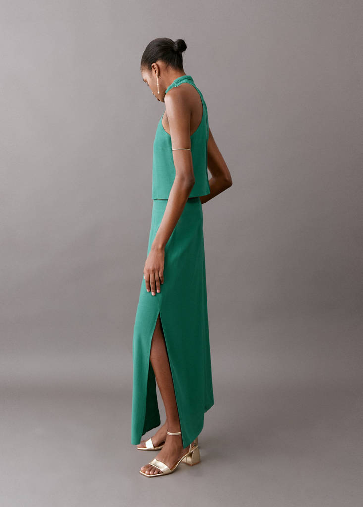 Текучая ткань. Прямой крой. Длинный дизайн. Боковой разрез на подоле. Застежка-молния сзади. Total look. Коллекция для праздников и мероприятий.