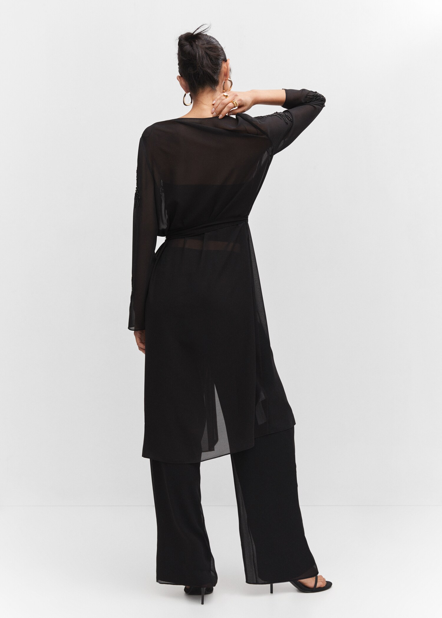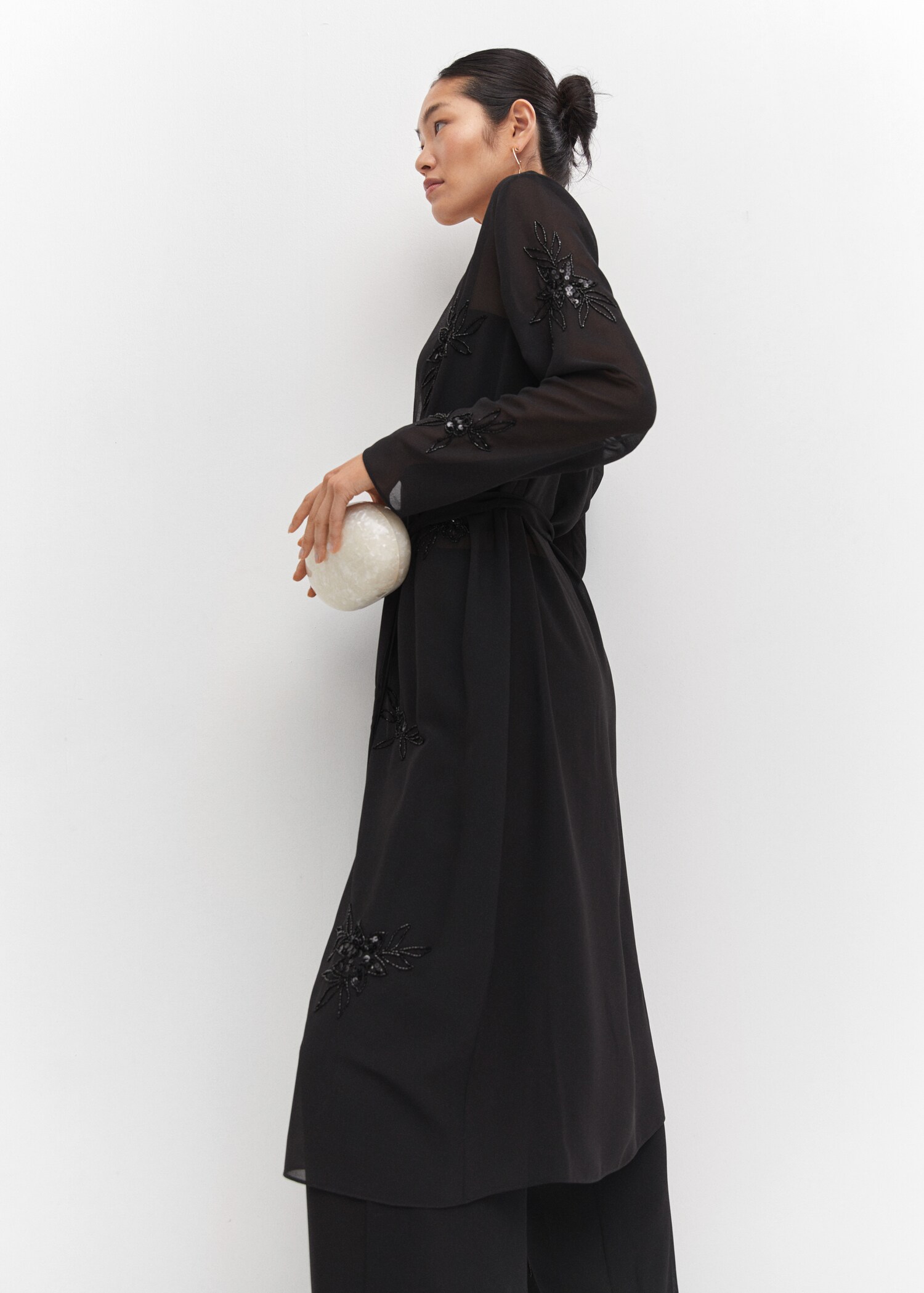 Прямой фасон. Длинный фасон. Пояс. Изделие украшено бусинками. Длинные рукава. Без застежки. Тотальный образ. Коллекция для вечеринок и торжеств.