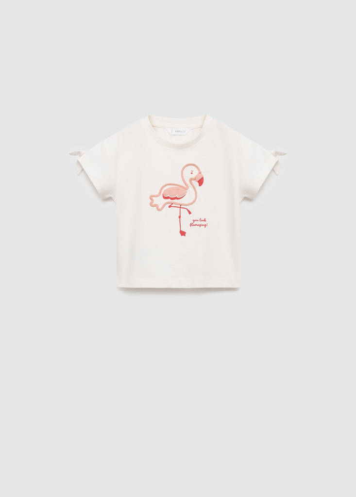Straight design. Flamingos print. Round neck. Short sleeves. Decorative bow on the sleeve