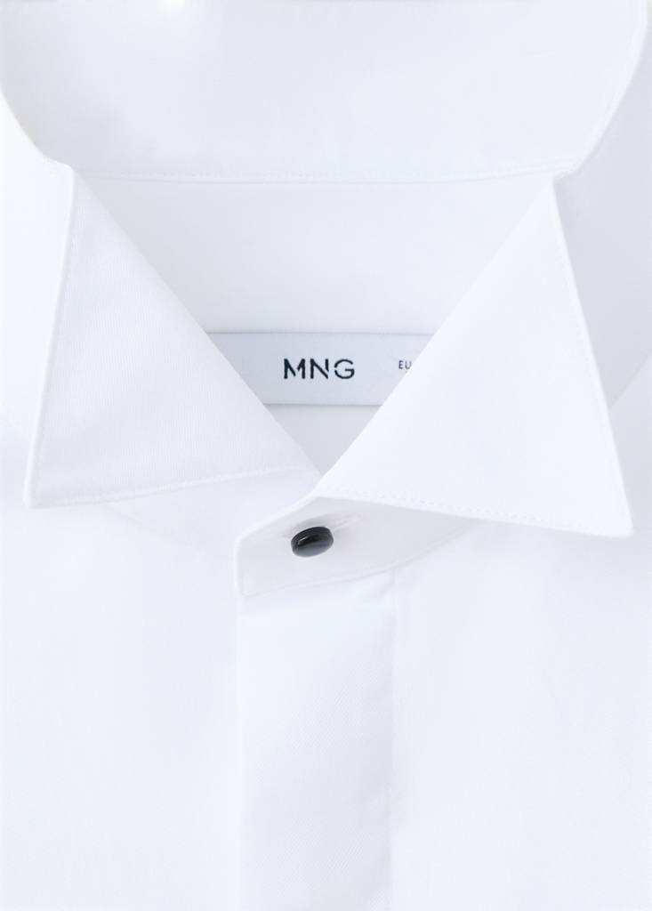 Slim fit. 100% cotton fabric. Neck lapel Tuxedo. Long sleeves with buttoned strip cuffs. Front closure with buttons