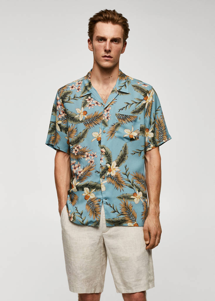 Regular fit. Fluid fabric. Bowling collar. Patch pocket on the chest. Short sleeves. Straight hem. Front closure with buttons