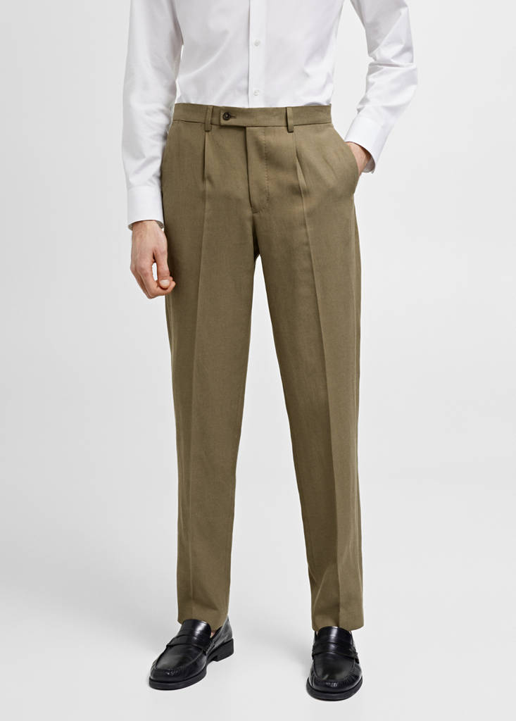 Antoine Griezmann Campaign. Slim fit. Cotton and linen blend fabric. Mid-rise. Belt loops. Button, hook and zip closure. Front pleat detail. Two front pockets. Welt pocket with button on the back. Tailoring collection. Pressed crease detail at the front and back