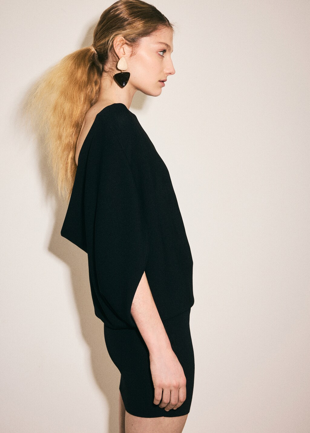 Fine knit fabric. Fitted design. Short design. Round neck. Short sleeves. Draped neckline. No Fastening