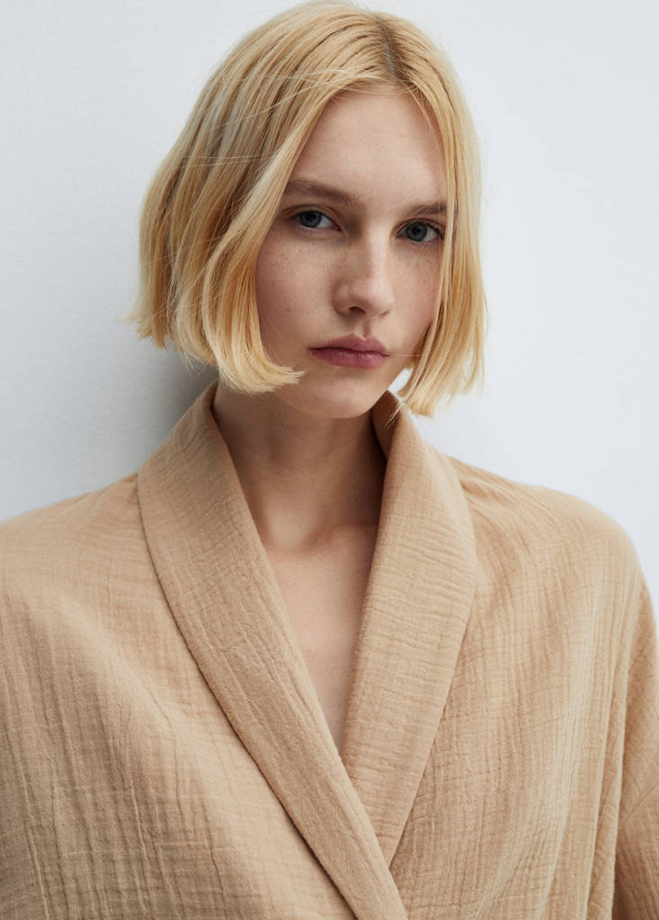 Gauze fabric. Fluid fabric. Straight design. Wrap design. Lapel-collar V-neck collar. Wrap neckline. Side bow fastening. Long flared sleeve. Total look. 100% cotton fabric