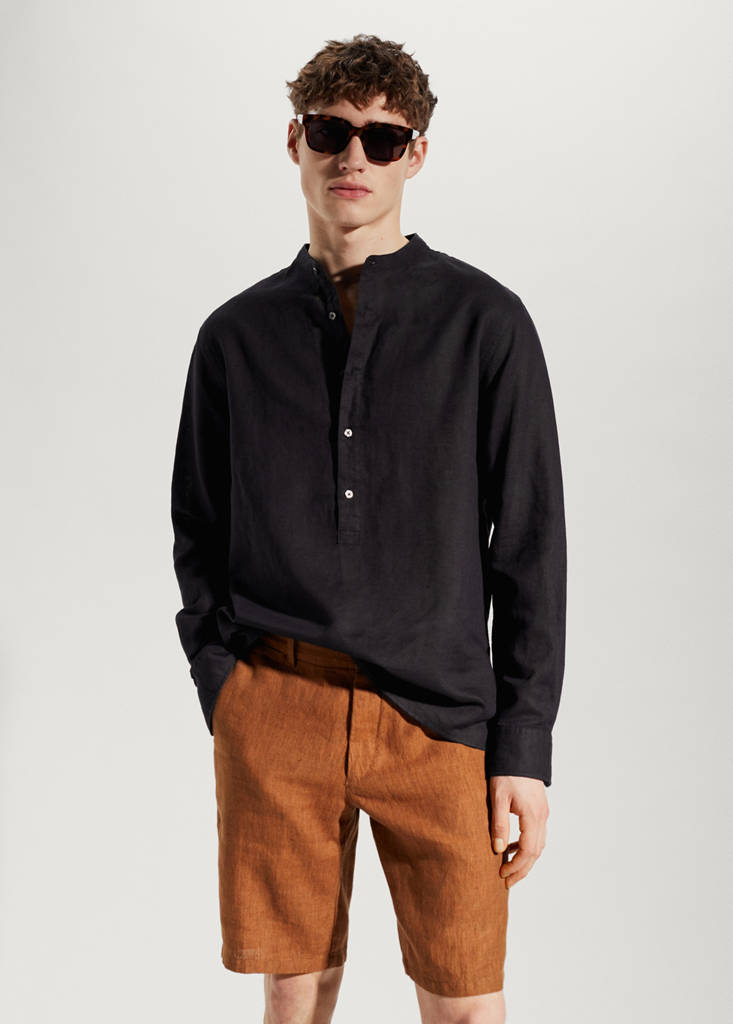 قطن وكتان مختلط. منتظم. خط رقبة قصير. نسيج خفيف. زر إغلاق أمامي. كم طويل بأزرار. مستقيم في الأسفل. فتحات جانبية في الأسفل