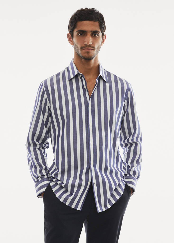 متناسق. تصميم مخطط. نسيج قطني مستدام. ياقة كلاسيكية. كم طويل بأزرار. إغلاق كل الفتحات. طول الموديل 180 سم ويرتدي مقاس M.