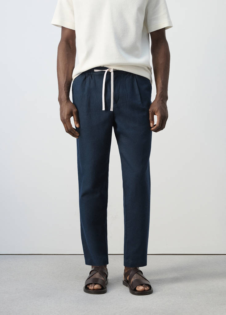 اللون الأسود حصري على الإنترنت. قصة سليم فيت. طول كروب. نسيج مزيج من القطن والكتان. خصر مطاطي بحبل قابل للتعديل. حبل مع خيار عقدة مرئية أو مخفية من الداخل. حلقات للحزام. إغلاق أمامي بأزرار مزدوجة وسحاب. أسهم في الأمام. جيبان أماميان. جيبان خلفيان مع زر