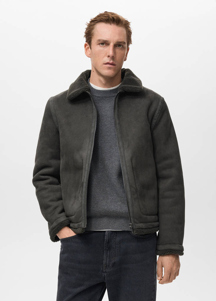 اللون البني الداكن متاح حصريًا عبر الإنترنت. قماش بتأثير الجلد المدبوغ. قصة مستقيمة. بطانة من الصوف. طوق قميص مع طوق من جلد الغنم. جيب داخلي. جيبان جانبيان بفتحة. إغلاق بسحاب أمامي.