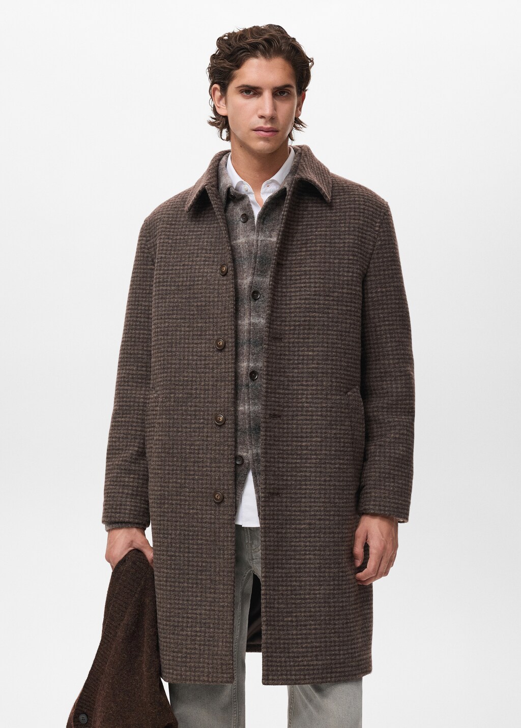 قوام مستقيم. بنية بترابيع دقيقة. نسيج مزيج مع الصوف. ياقة طية صدر السترة مسننة. جيبان جانبيان. مع بطانة داخلية. أكمام طويلة مع أساور بأزرار. فتحة خلفية في الأسفل. إغلاق أمامي بأزرار.