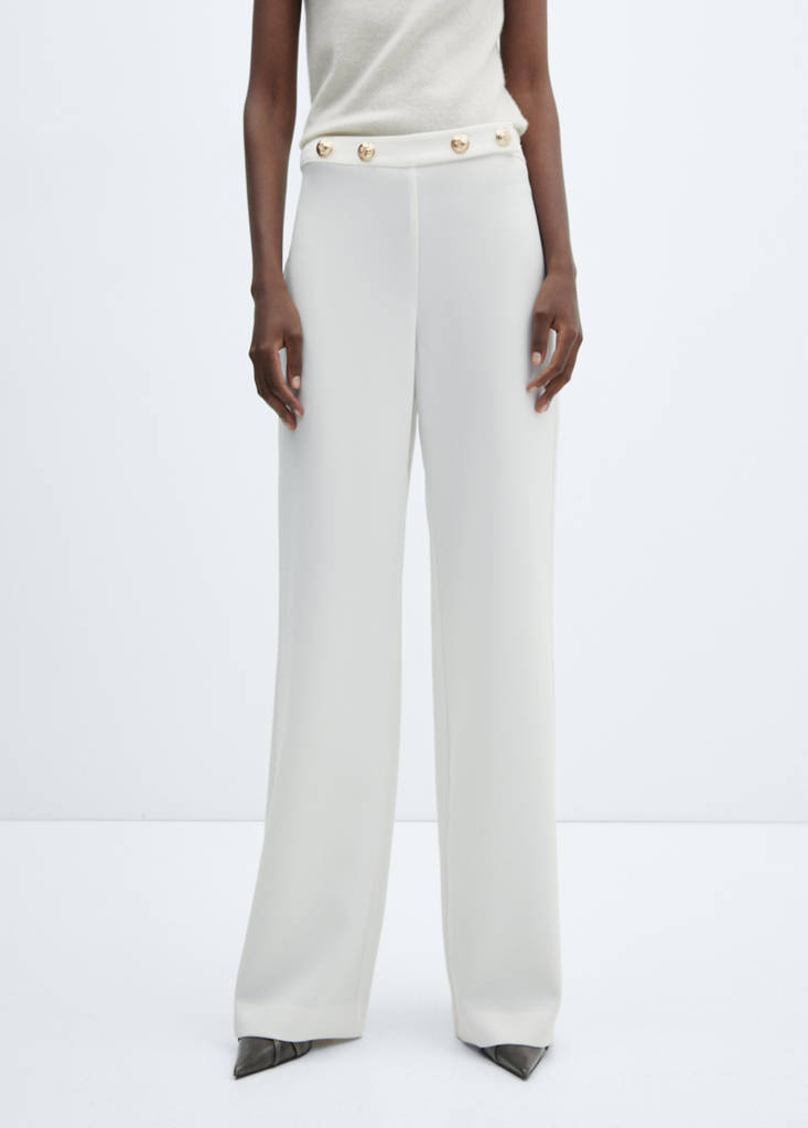 قماش انسيابي. تصميم طويل. تصميم واسع الساق. خصر عالي. إبزيم بسحاب جانبي. أزرار بتأثير الجوهرة. بطانة داخلية. إطلالات المكتب