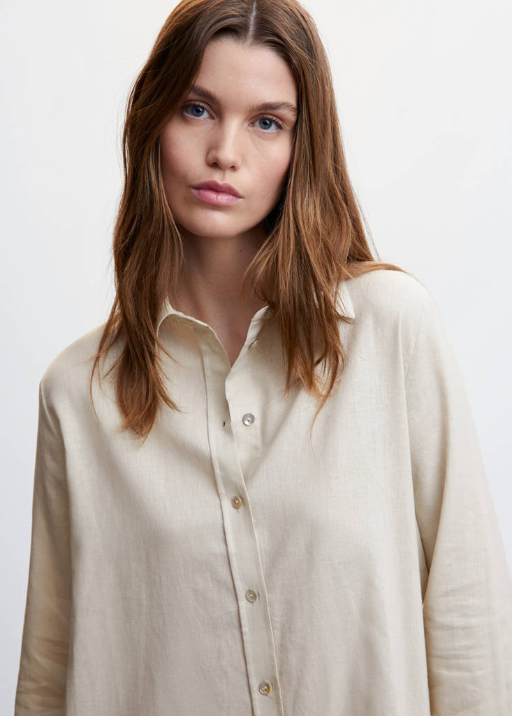 كتان. طراز قميص. تصميم مستقيم. تصميم طويل. ياقة قميص. كم طويل بأزرار. إبزيم بزر في الجزء الأمامي. حاشية مستديرة