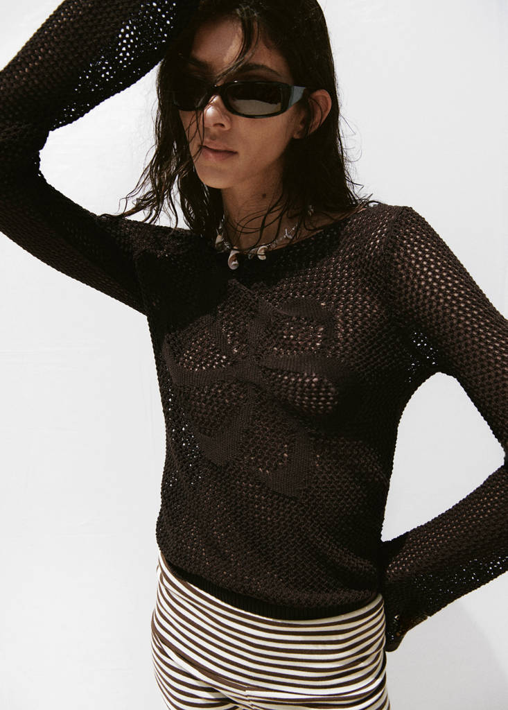 نسيج محبوك سميك. تصميم مستقيم. طيات بها ثقوب. تفاصيل تطريز زهرة. ياقة دائرية. أكمام طويلة. بدون سحاب. حصريًا عبر الإنترنت