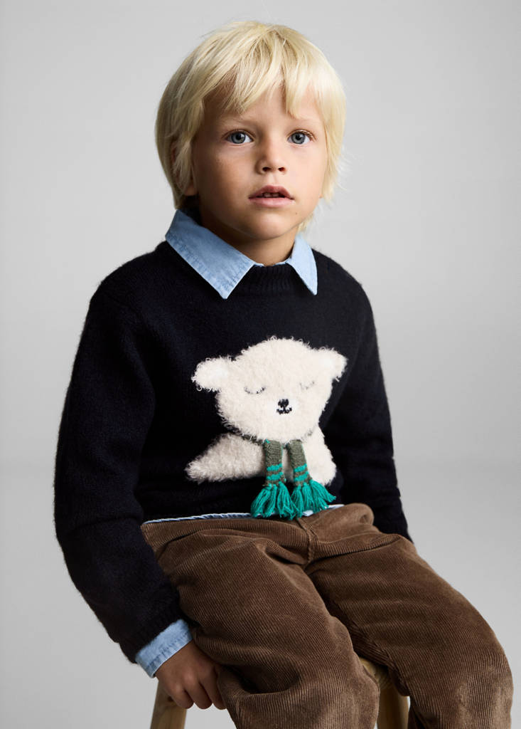 نسيج محبوك. تصميم مستقيم. تصميم دب. ياقة دائرية. أكمام طويلة. قفل على الأكتاف. أزرار على الكتفين. مجموعة عيد الميلاد