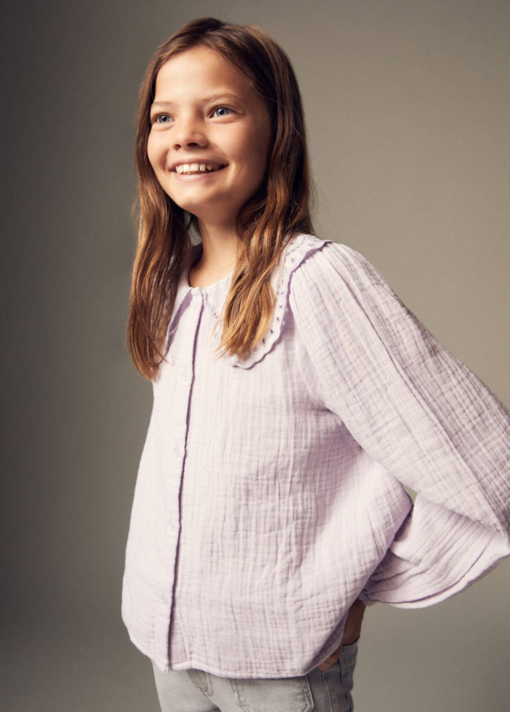 100% قطن. تصميم مطوي. تفصيل مطرز. ياقة بابيدول. أكمام طويلة. إغلاق بأزرار
