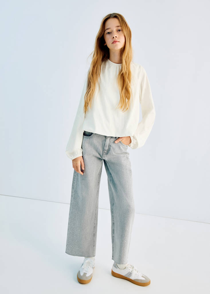 نسيج 100% قطن. تصميم مستقيم. ياقة مستديرة مع قفل أزرار. تفاصيل مجمعة في الرقبة. أكمام طويلة بحواف مضلعة. أهداب على شكل بالون