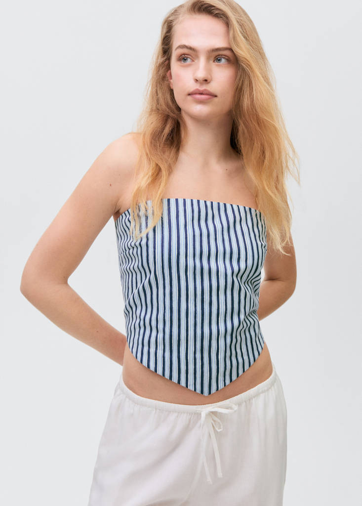 100% قطن. تصميم مستقيم. تصميم قصير. نقشة مخططة. تصميم بدون أكتاف. حاشية مدببة