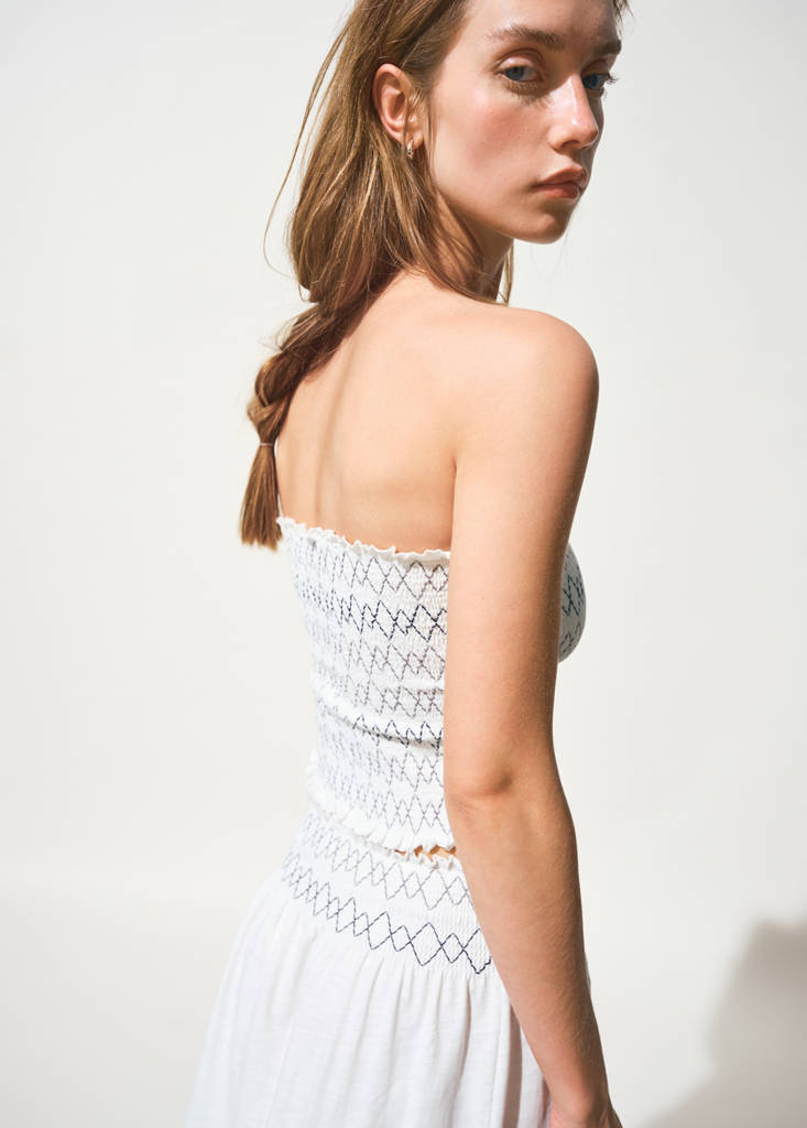 نسيج 100% قطن. تصميم مستقيم. تصميم ضيق. تصميم بدون أكتاف. حمالات رفيعة قابلة للتعديل. تفاصيل مطرزة. ثنائي اللون