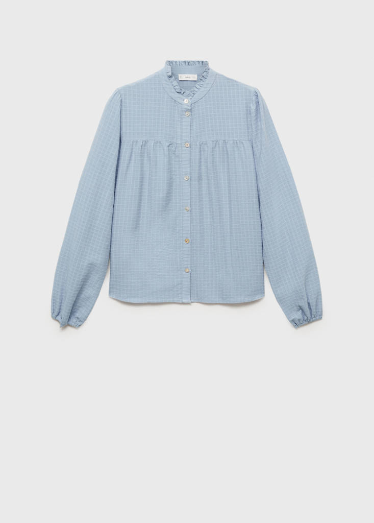 نسيج 100% قطن. فحص النسيج. ياقة دائرية. تفاصيل بكشكشة مزخرفة. كم طويل منتفخ. إغلاق بأزرار في الجزء الأمامي