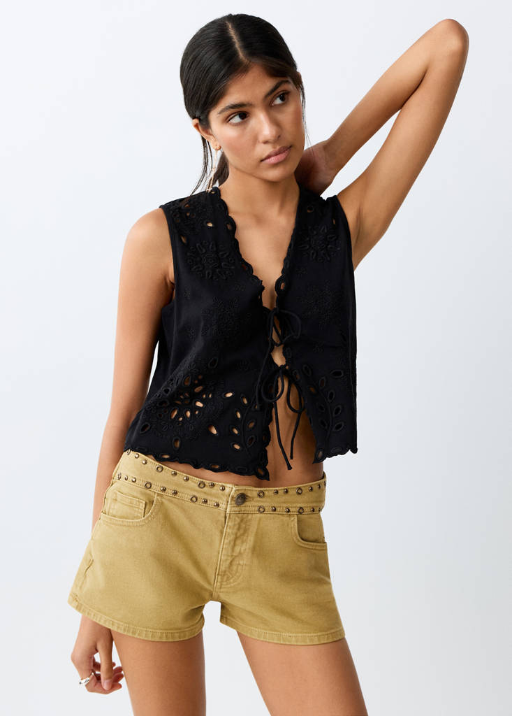 قماش قطني بأسلوب جينز كاوبوي. تصميم مستقيم. قصة ميني. خصر منخفض. خمسة جيوب. إغلاق بسحاب وزر. تفاصيل المسامير
