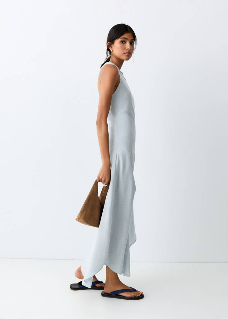 قماش انسيابي. تصميم مستقيم. تصميم طويل. ياقة دائرية. حمالات. ظهر متقاطع. ظهر مفتوح. بطانة داخلية قطنية