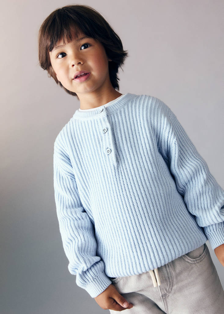 Knitted fabric. 100% Cotton. Straight design. Round neck with button closure. Long sleeves. Ribbed collar, cuffs and hem.