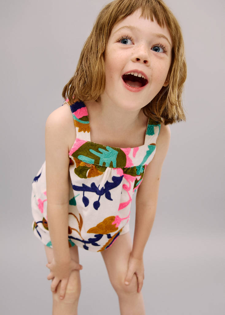 Cotton fabric. Linen fabric. A-line design. Embroidered design. Multicolour design. Square Neckline. Wide straps. Ruched detail at the front. Total look