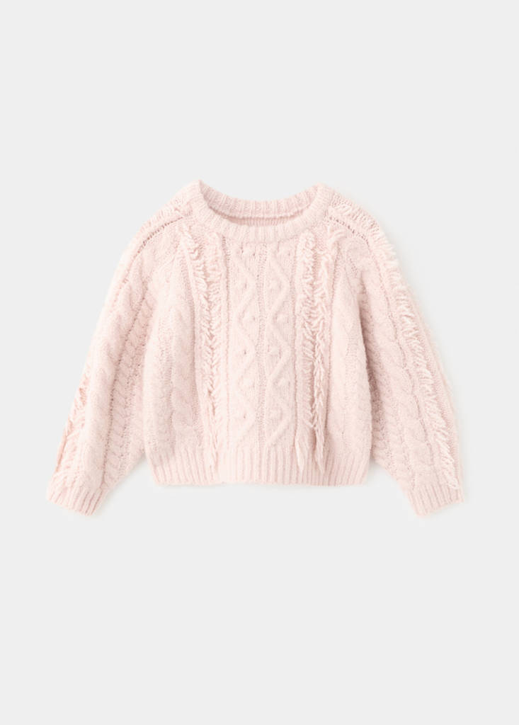 Knitted braided fabric. Wool fabric. Straight design. Round neck. Long sleeves. Ribbed collar, cuffs and hem. Fringe detail.