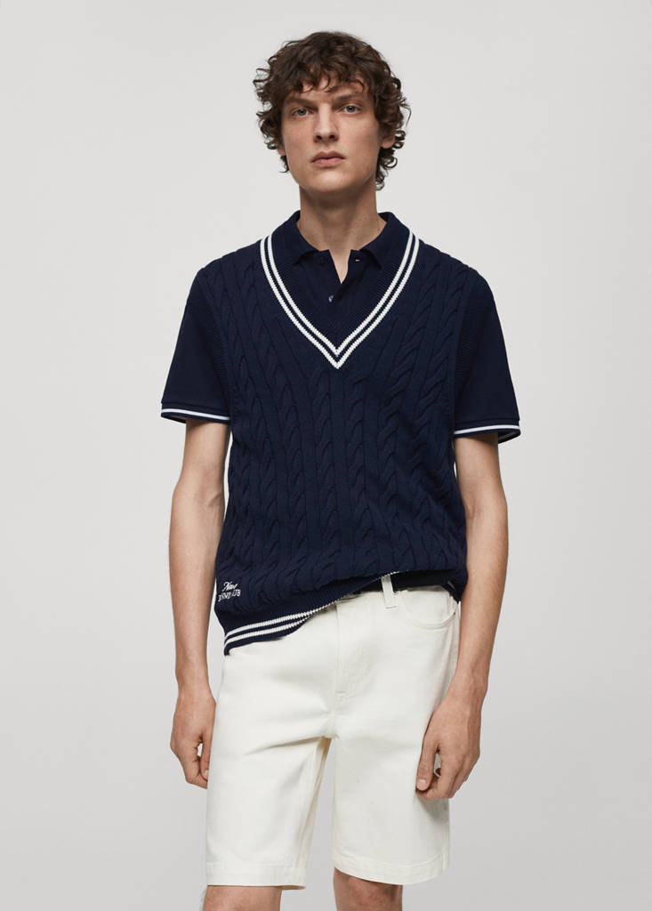 Mango Tennis Club Collection. Knitted braided fabric. Double-stripe print detail on the neck and hem. Ribbed polo-neck with V-neck finish. Sleeveless. Embroidered message on the hem. Straight hem with ribbed ends. 100% cotton fabric