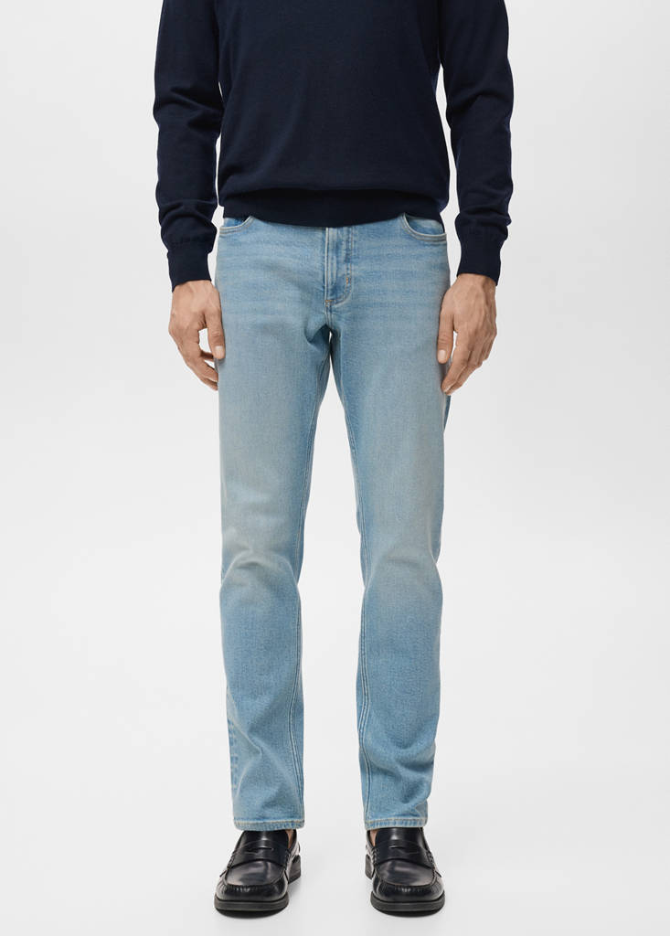 Slim fit. Cotton fabric. Denim jeans style. Button and zip fastening. Side pockets. Coin pocket. Two patch pockets at the back. Light faded wash. Denim-style cotton fabric. Five pockets. Two front pockets. Standard Length. Slim Silhouette. Regular Waist.