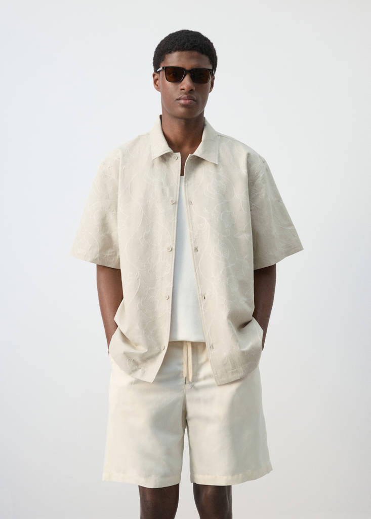 Linen and cotton blend fabric. Regular Fit Design. Shirt collar. Short sleeves. Front closure with buttons. Straight hem