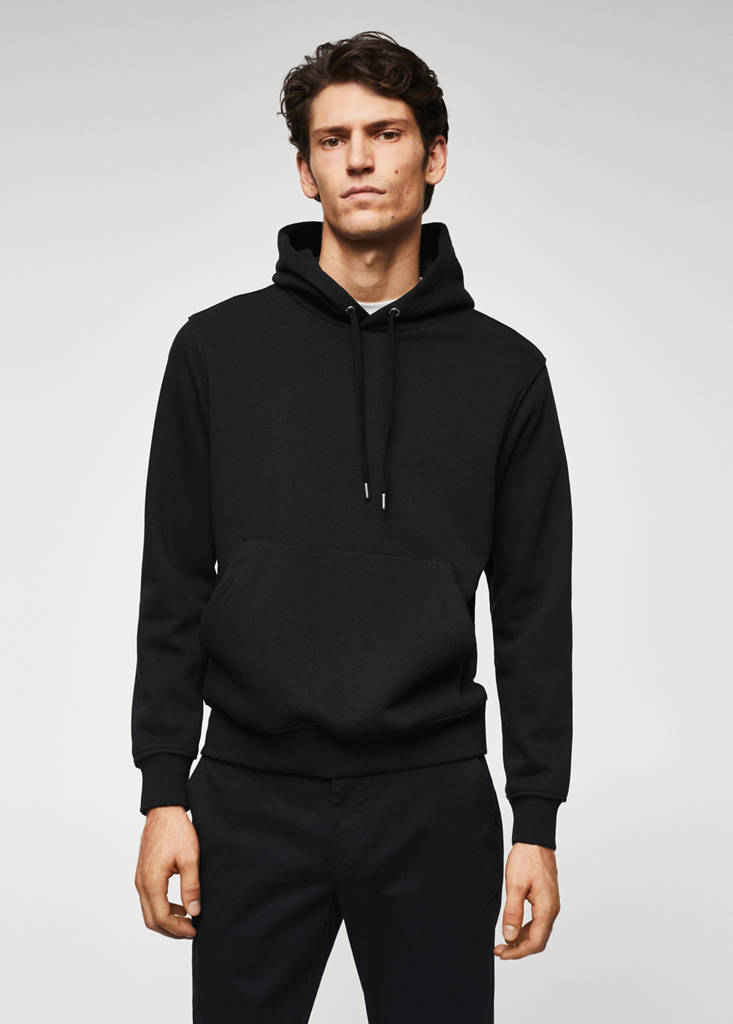 Basics Collection. Regular fit. Sustainable cotton blend fabric. Drawstring hood. Long sleeves. Pouch pocket. Elastic finish. The model is wearing a size M