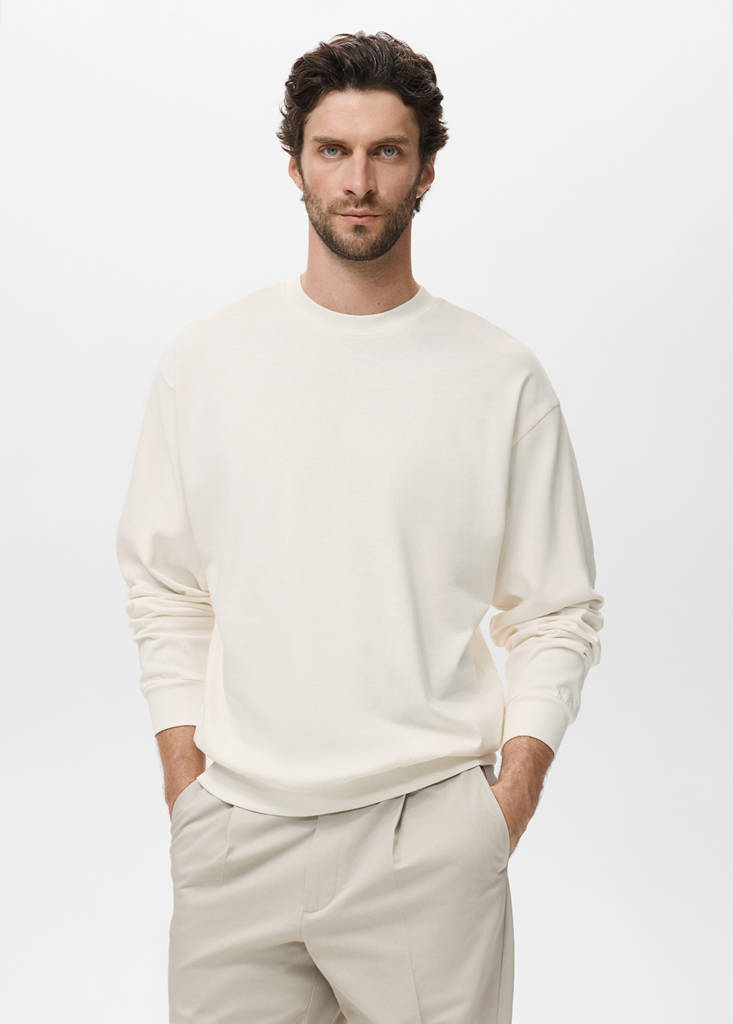 100% cotton fabric. Silhouette Boxy. Cotton blend fabric with brushed interior. Round neck. Ribbed collar, cuffs and hem. Straight hem.