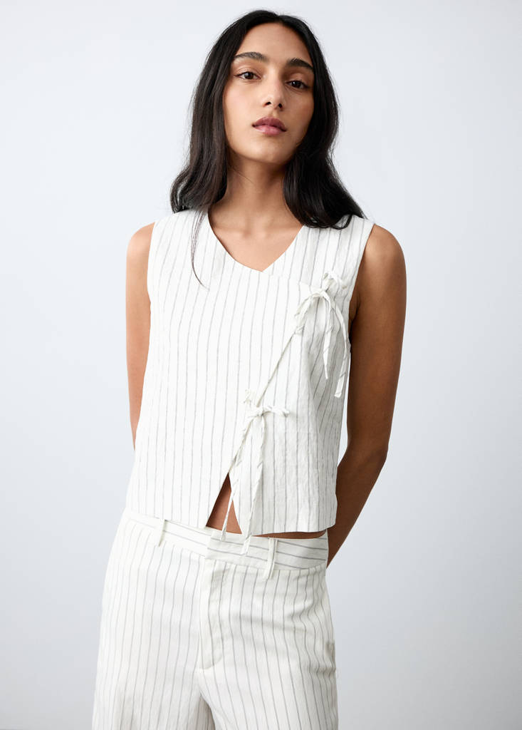 Straight design. Striped print. Cross-over V-neck. Sleeveless. Wide strap. Crossed bow closure. Total look.