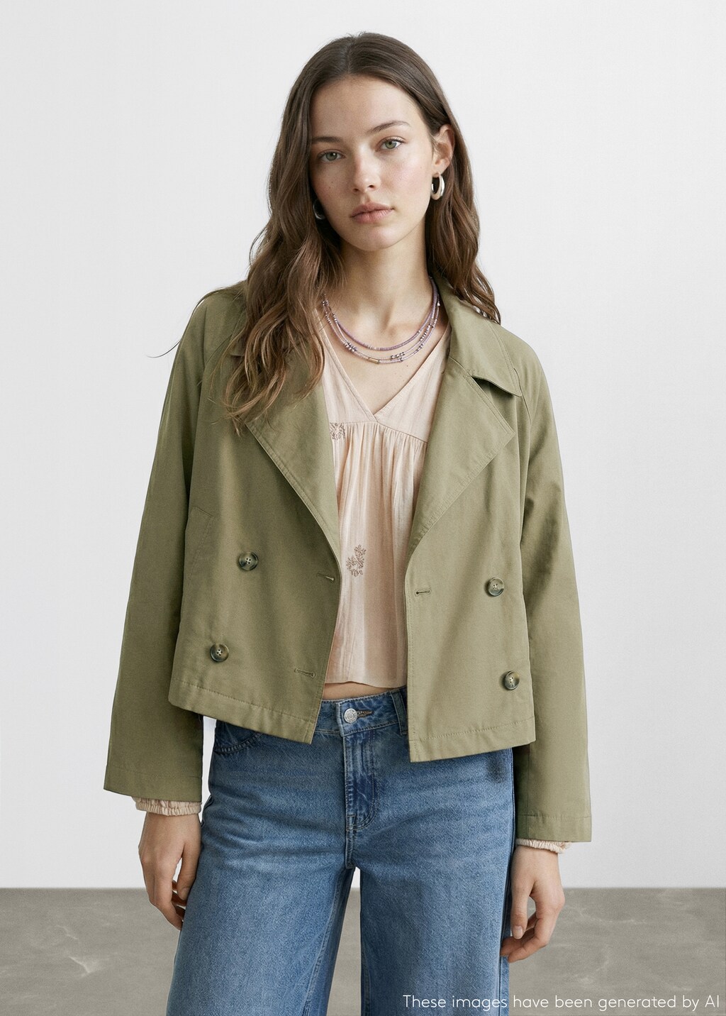 Cotton blend fabric. Straight design. Crop design. Lapel-collar V-neck collar. Long sleeves. Two side pockets. Front closure with buttons.