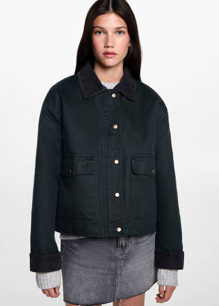 Fabric with cotton. Straight design. Corduroy details. Short design. Two side pockets. Zip and button fastening. Back to class