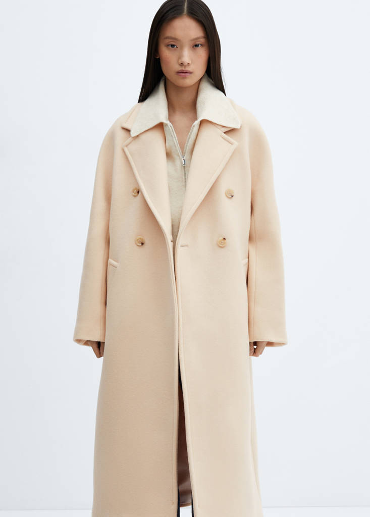 Italian Manteco wool fabric. Virgin wool blend fabric. Long design. Oversized design. Lapel-collar V-neck collar. Lapel with notch. Long sleeves. Two side pockets. Double button fastening. Inner lining
