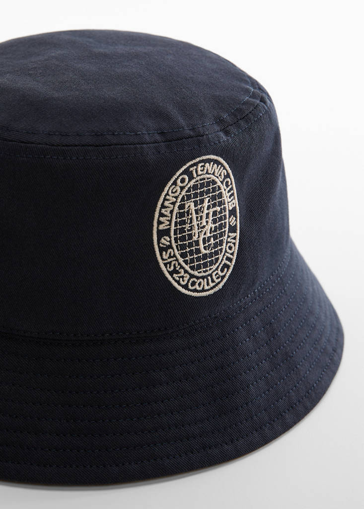 Embroidered bucket hatCurrent price [LBP 2,999,000.00 ]LBP 2,999,000.00Select a colourNavySelect your sizeOne sizeAdd to WishlistSee lookFree delivery to store100% cotton fabric. Bucket design. Embroidered logo. Unclosed. Mango Tennis Club CollectionDetails, composition and careStore availability