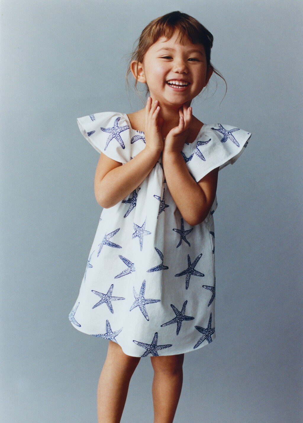 Party- und Zeremonie-Kollektion. Leinen-Baumwoll-Mix. Volant-Dessin. Seestern-Verzierung. Quadratischer Kragen. Kurze Ärmel. Ohne Verschluss.
