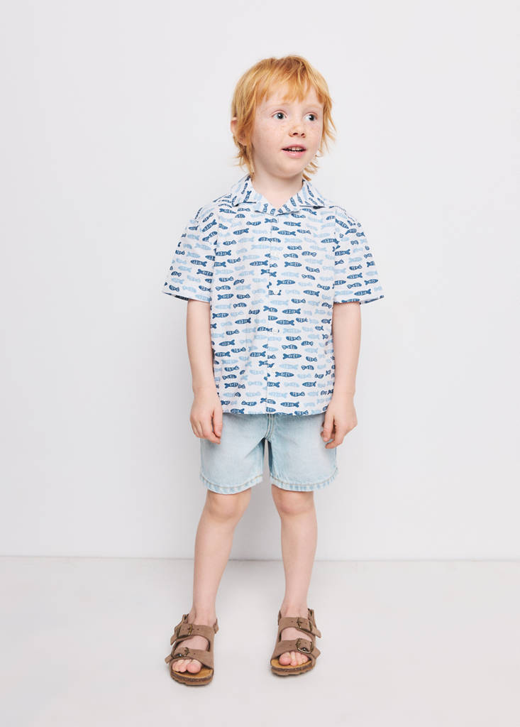 100% Baumwolle. Fisch-Print. Gerades Design. Hemdkragen. Kurze Ärmel. Vorderer Verschluss mit Knöpfen