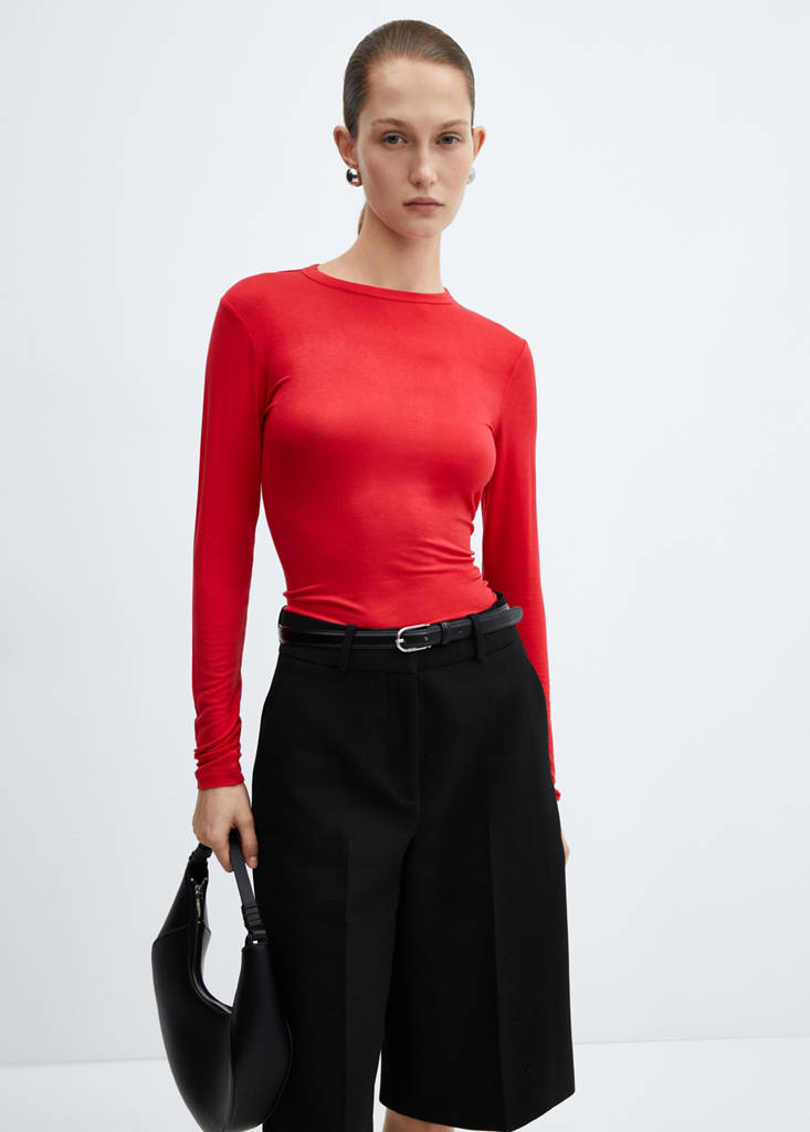 Fließender Stoff. Elastischer Stoff. Slim Fit. Rundhalsausschnitt. Lange Ärmel. Büro-Looks. Tailliertes Design