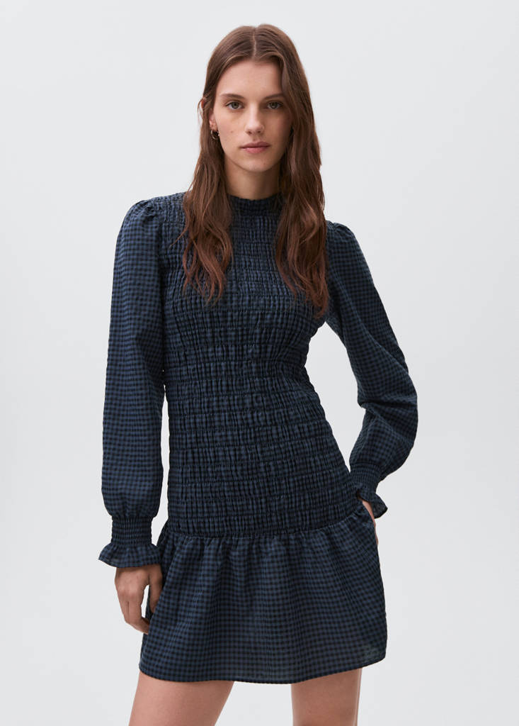 Baumwollstoff. Karierter Stoff. Kurzes Design. Rundhalsausschnitt mit Raffung. Lange Ärmel mit elastischen Bündchen. Kleidoberteil mit gesmokten Raffungen. Gerüschter Saum. Knopfverschluss hinten