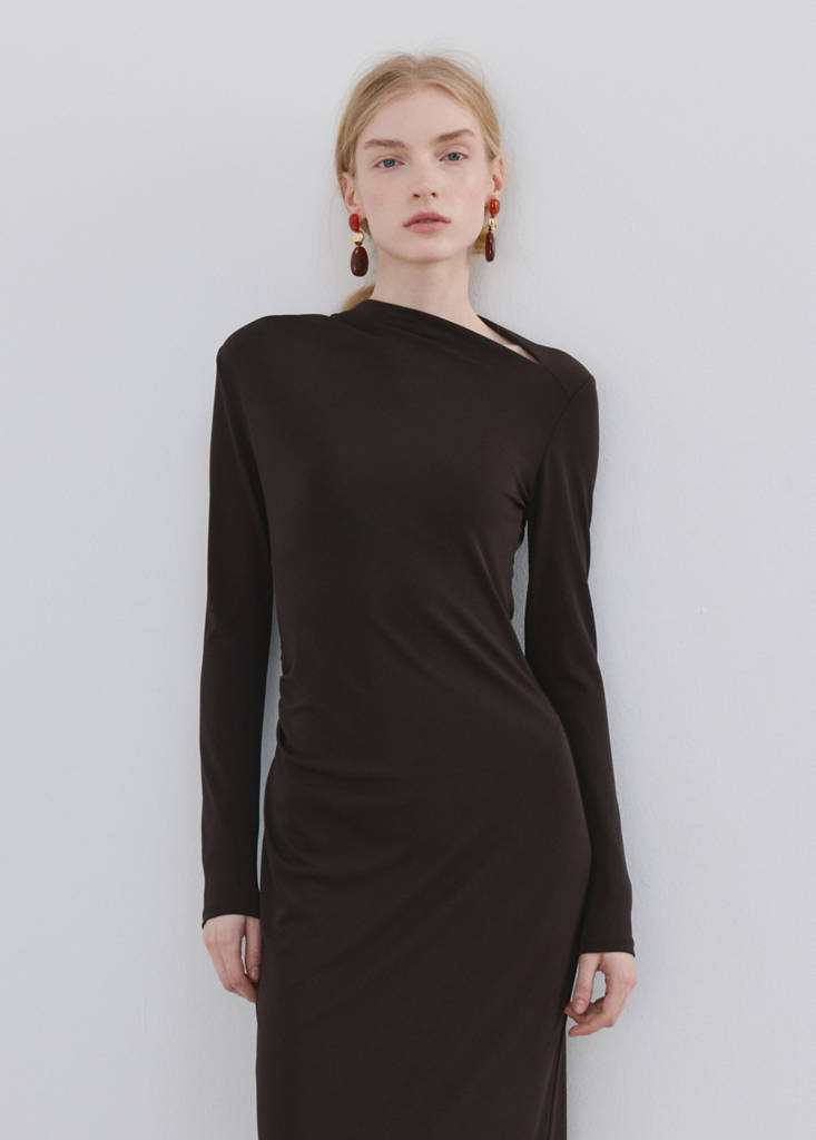 Straight design. Long design. Gathered detail. Boat neckline. Long sleeves. No Fastening. Available Plus